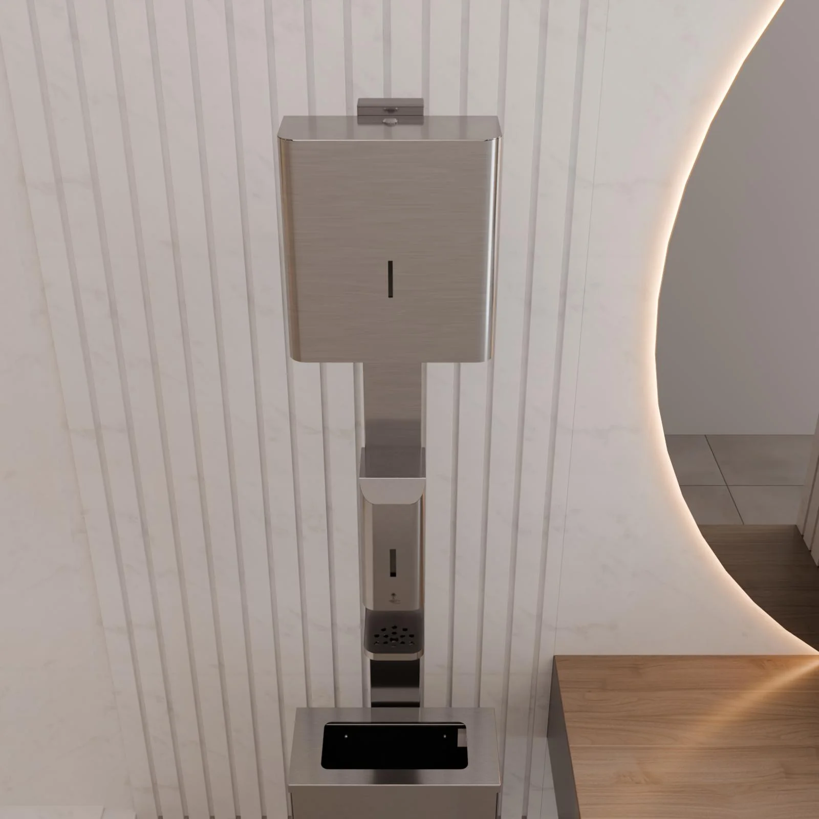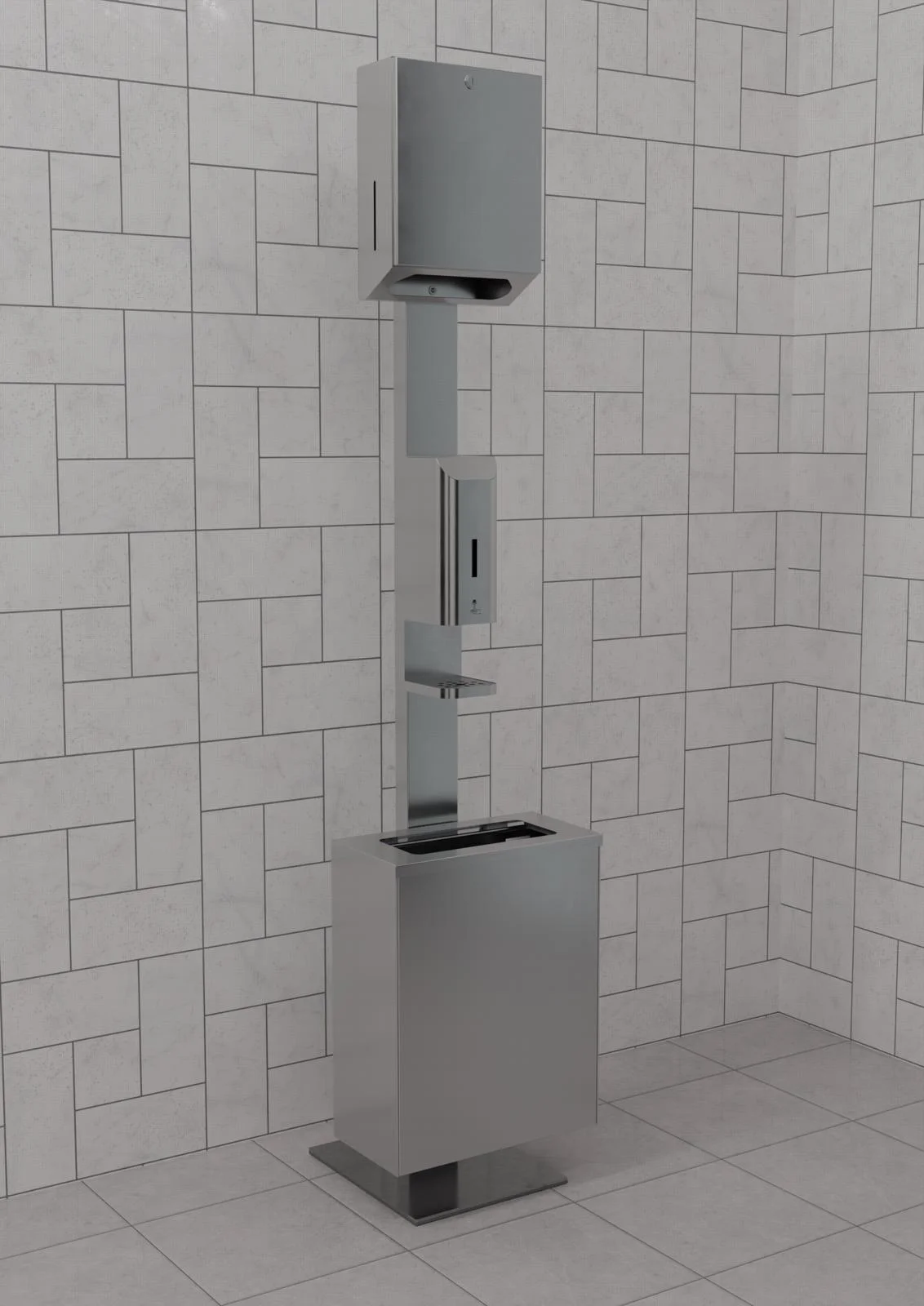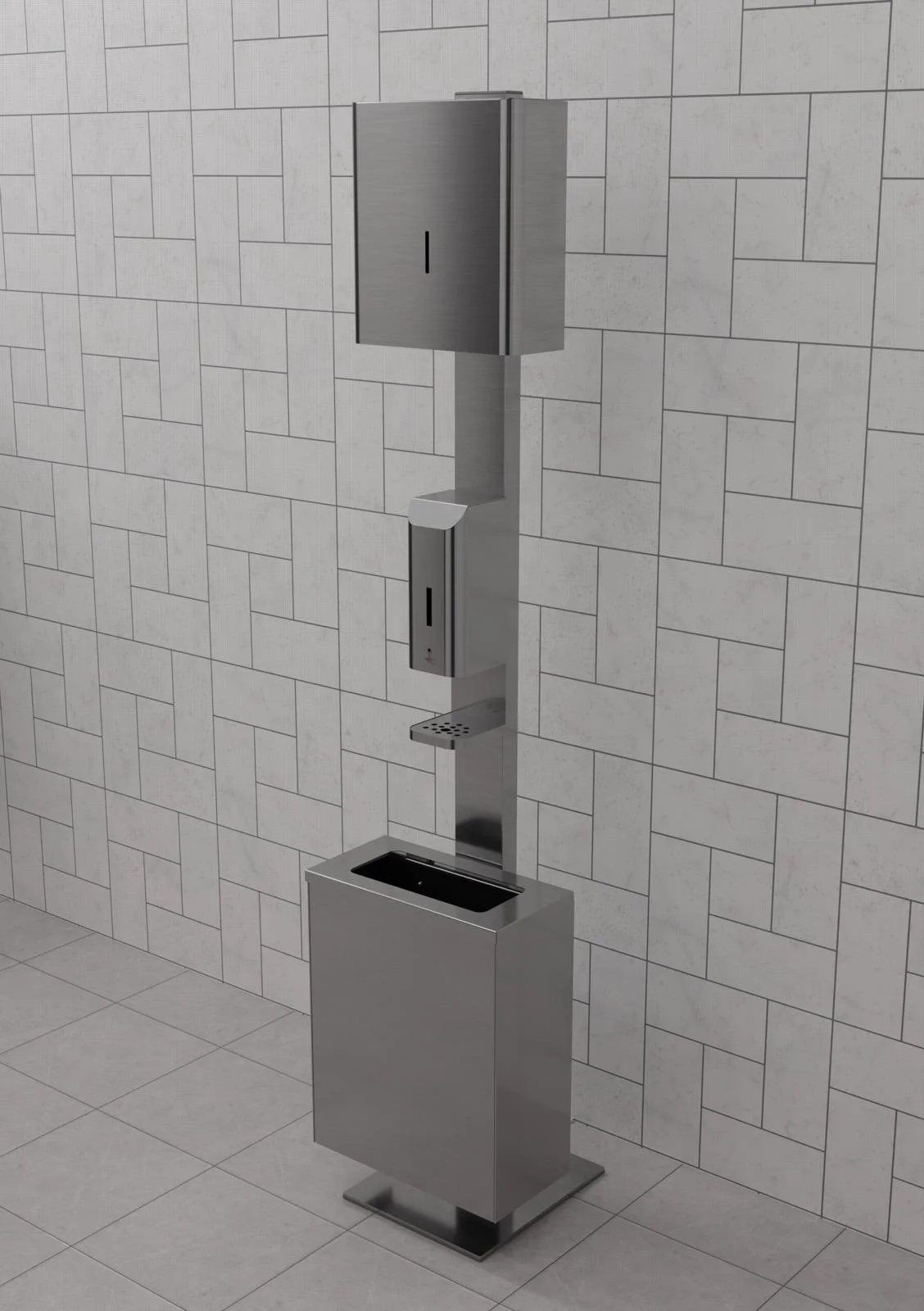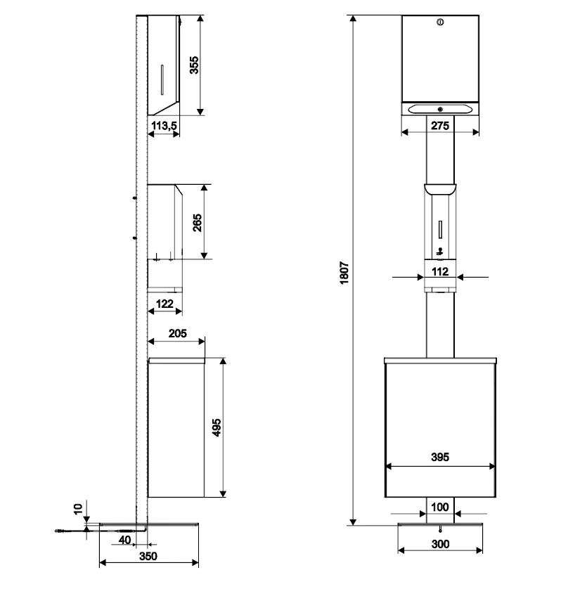 Voľne stojací dezinfekčný stĺp s výklopným nerezovým košom a dávkovačom papierových utierok je určený k bezdotykovému dávkovaniu tekutého mydla alebo dezinfekčného prostriedku. Po vložení ruky do zóny snímania zariadenie nadávkuje jednu dávku náplne. Prednastavené dávkovanie trvá 0,75 sekundy, čo zodpovedá objemu približne 1ml ,v závislosti od viskozity kvapaliny v dávkovači. Objem nádrže na kvapalinu je 1l.