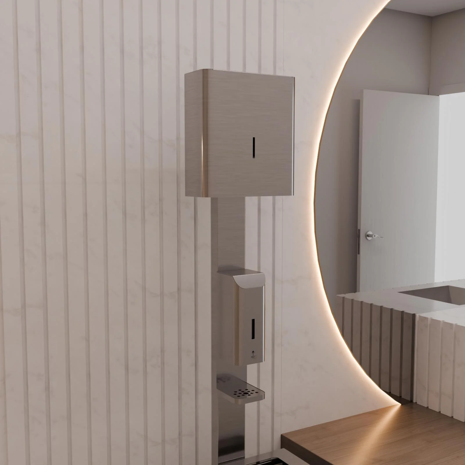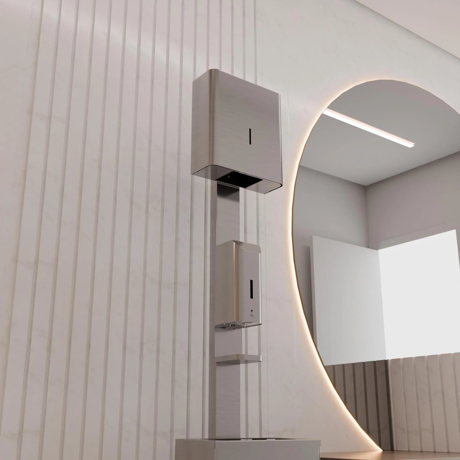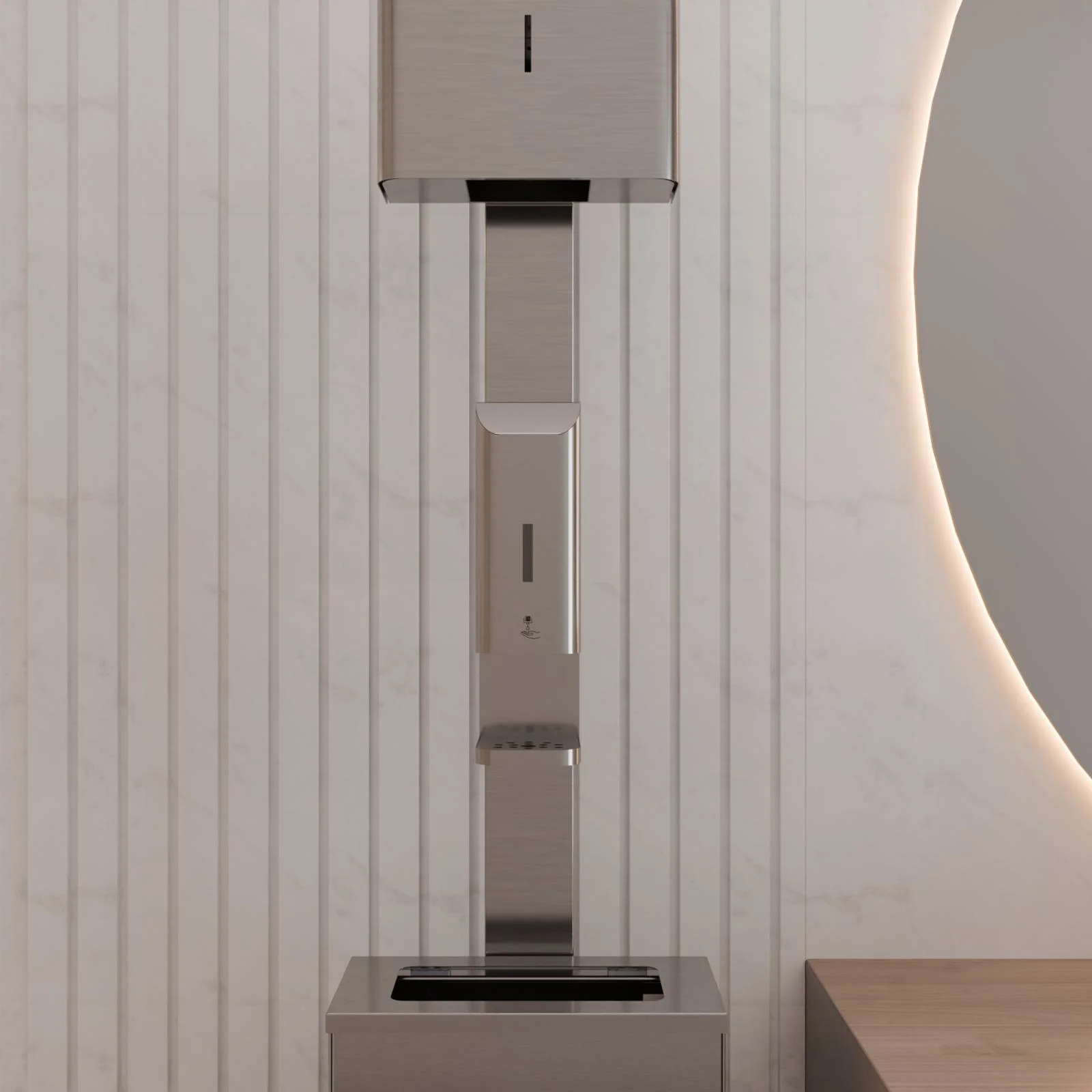 Voľne stojací dezinfekčný stĺp s výklopným nerezovým košom a dávkovačom papierových utierok je určený k bezdotykovému dávkovaniu tekutého mydla alebo dezinfekčného prostriedku. Po vložení ruky do zóny snímania zariadenie nadávkuje jednu dávku náplne. Prednastavené dávkovanie trvá 0,75 sekundy, čo zodpovedá objemu približne 1ml ,v závislosti od viskozity kvapaliny v dávkovači. Objem nádrže na kvapalinu je 1l.